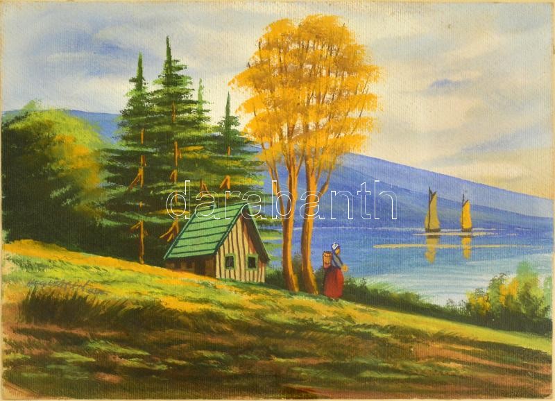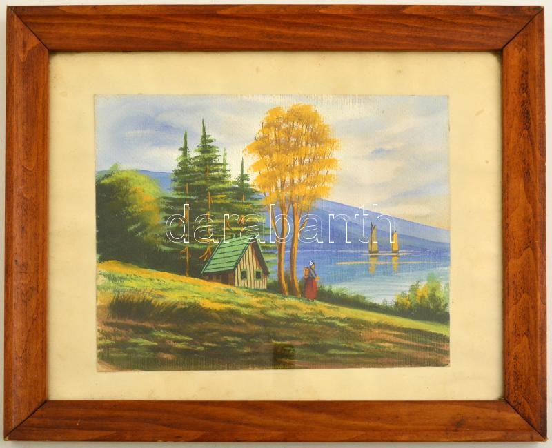 Olvashatatlan jelzéssel: Házikó a partnál. Gouache, papír, üvegezett k...