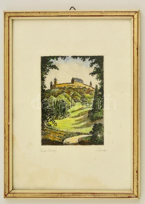 Olvashatatlan jelzéssel: Veste Coburg. Színezett rézkarc, papír, üvegezett keretben, 12×9 cm