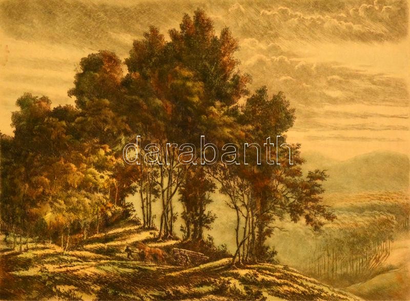 Paulovits Pál (1892-1975): Erdő. Színezett rézkarc, papír, jelzett, foltos, 28×40 cm