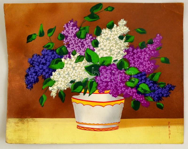 Poldi jelzéssel: Virágcsendélet. Vegyes technika, karton, foltos, 38×4...