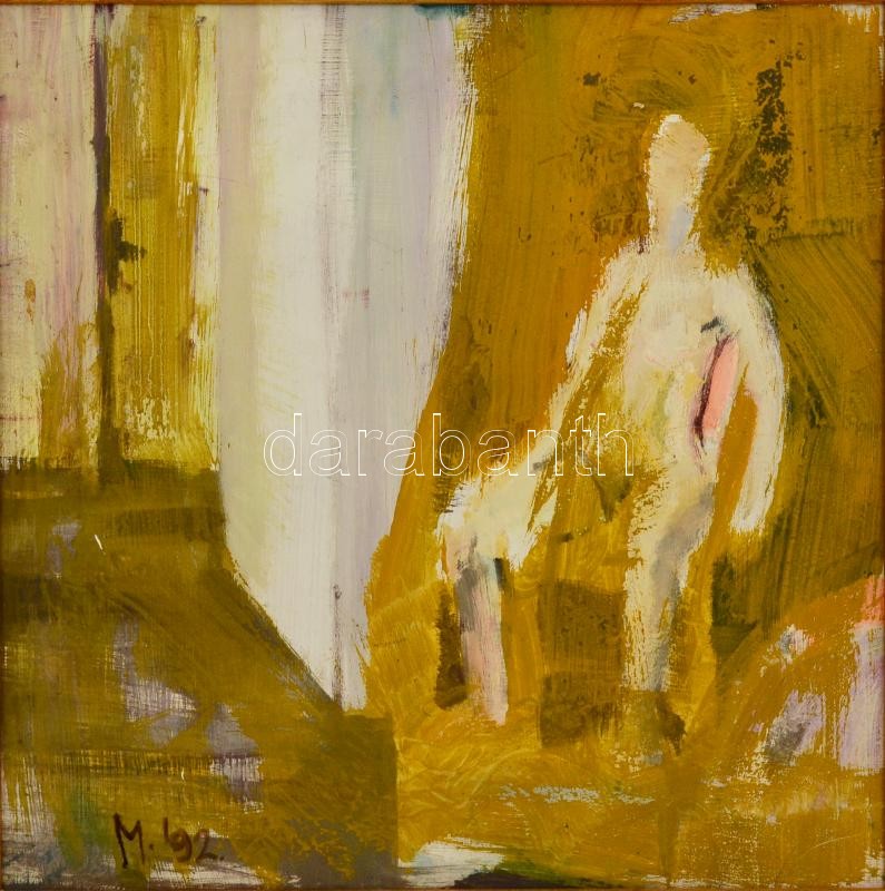 Varga Patrícia Minerva (1963- ): Széken ülve, olaj, fa, jelzett, keretben, 43×43 cm