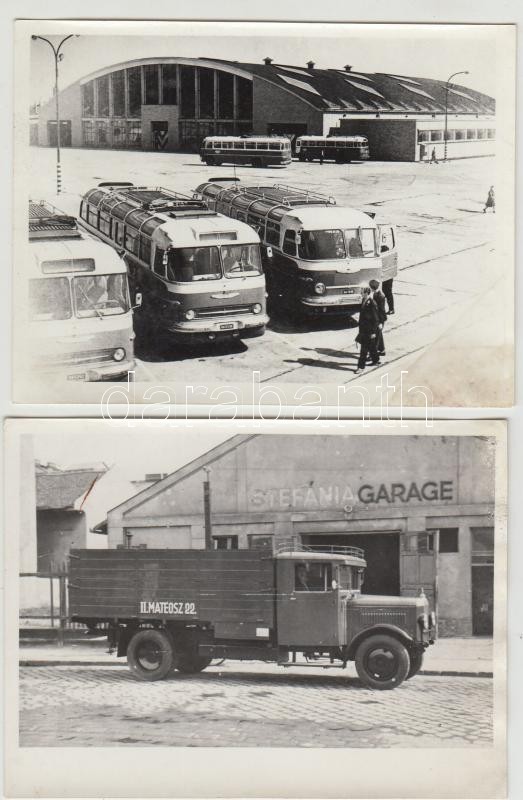 cca 1930-1960 Budapest, Teherautó a Stefánia Garázs előtt, és a Kelenföldi autóbuszgarázs buszokkal, 2 db későbbi sajtófotó, 9x12 cm