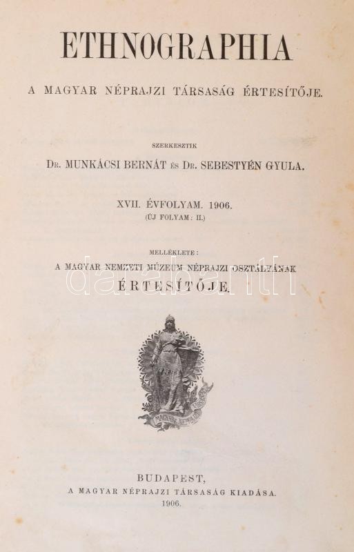 1906 Ethnographia. A Magyar Néprajzi Társaság értesítője. Szerk.: Dr. Munkácsi Bernát, Dr. Sebestyén Gyula. XVII. évfolyam. Bp., Magyar Néprajzi Társaság. +A Magyar Nemzeti Múzeum Néprajzi Osztályának Értesítője. Az "Ethnographia" melléklete. Szerk.: Dr. Semayer Vilibáld. VII. évf. Bp., Magyar Nemzeti Múzeum. Korabeli átkötött félvászon-kötés, márványozott lapélekkel, IV+1+384+IV+316 p.+4 t. (3 színes,1 fekete-fehér.) Teljes!