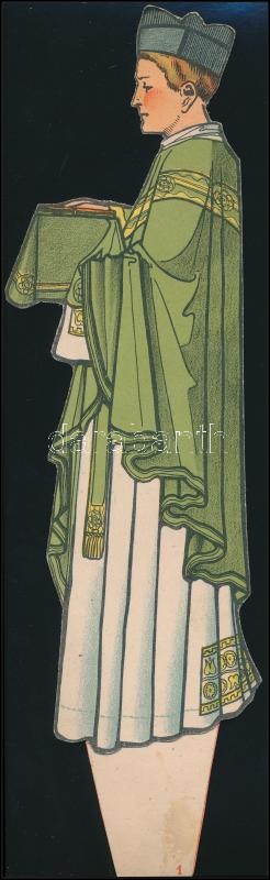 Description: 1916-1948 Főként vallási témájú nyomtatványok 3 db: Szent Család XXVII. évf. 6. füzet, Bogner Mária Margit Kis Naptára, Vasárnapi Könyv + papot ábrázoló papírfigura