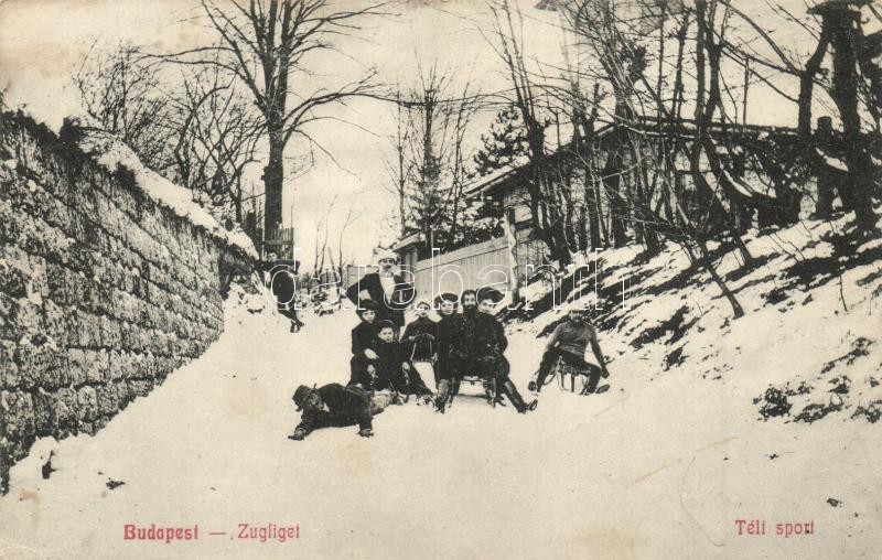 Budapest XII. Zugliget, téli sport, szánkózók a hóban