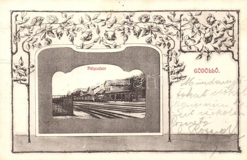 Gödöllő, vasútállomás gőzmozdonnyal. Art Nouveau, floral. Kiadja Wilsz...