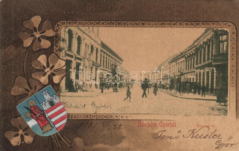 Győr, Baross út, üzletek. Rőszler Károly kiadása, Art Nouveau címeres litho keret (EK)