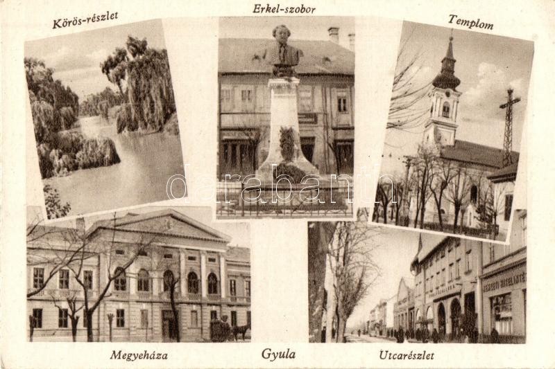 Gyula, Erkel szobor, Körös részlet, templom, utcakép, megyeháza, hitel...