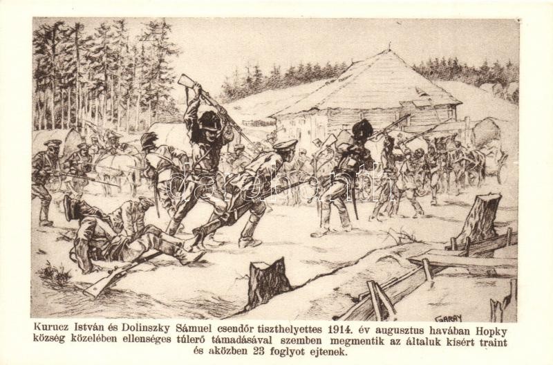 Description: Kurucz István és Dolinszky Sámuel csendőr tiszthelyettes 1914. év augusztus havában Hopky község közelében ellenséges túlerő támadásával szemben megmentik az általuk kisért traint és aközben 23 foglyot ejtenek. Kiadja a Csendőrségi emlék-alap / WWI Hungarian gendarmerie s: Garay (apró lyuk / tiny hole)