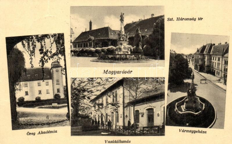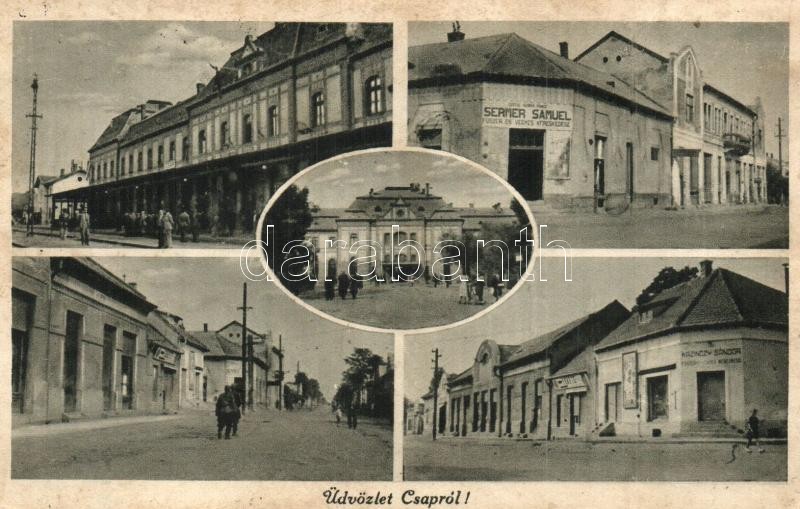 Description: 5 db régi magyar és történelmi magyar mozaik városképes lap, vasútállomásokkal: Békéscsaba, Nyíregyháza, Mosonmagyaróvár, Kál-Kápolna, Csap / 5 pre-1945 Hungarian and Historical Hungarian multi-view postcards with railway stations