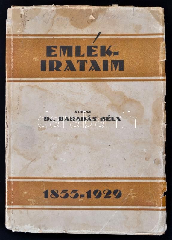Albisi Dr. Barabás Béla: Emlékirataim. Arad, 1929, Corvin Könyvnyomdai Műintézet, 318+1 p. Második kiadás. Kiadói papírkötés, a borító szakadozott, foltos borítóval, javított gerinccel, a gerinc felső részén hiánnyal, részben felvágatlan lapokkal.