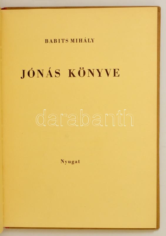 Babits Mihály: Jónás könyve. Bp. 1939, Nyugat. Első kiadás. Kiadói fél... https://www.darabanth.com/en/314-Online-auction/314.0/Books/Books-Other-rarities~100046/Babits-Mihaly-Jonas-konyve-Bp-1939-Nyugat-Elso-kiadas-Kiadoi-felvaszon-kotesben-sz~II1722461