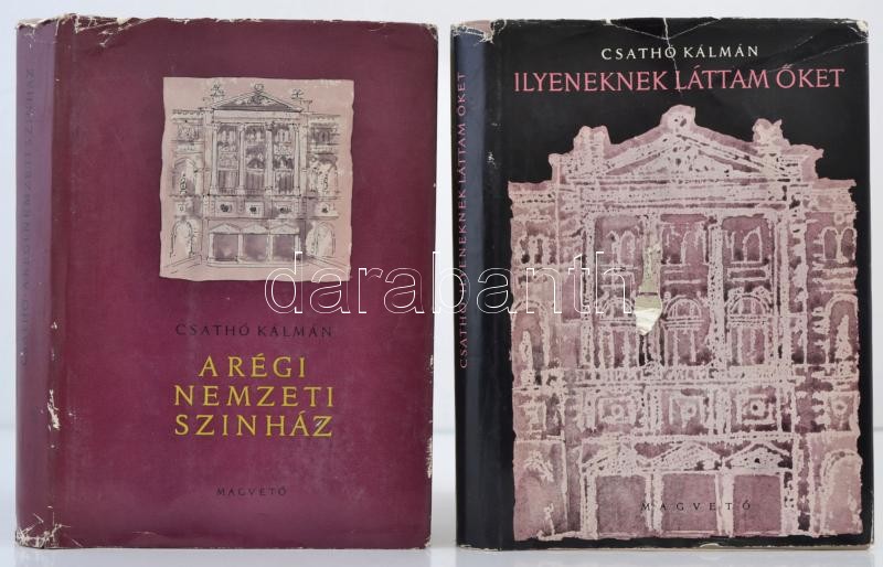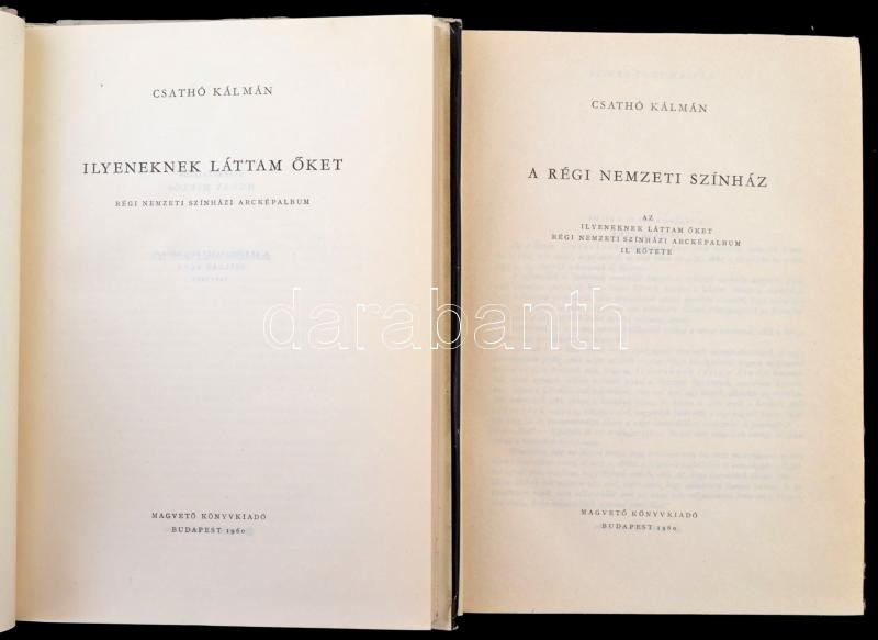 Csathó Kálmán: Ilyeneknek láttam őket. Régi Nemzeti Színházi arcképalbum. Bp.,1960, Magvető. Kiadói félvászon-kötés, kiadói papír védőborítóban, a papírborítón szakadással. A régi Nemzeti Színház. Az Ilyeneknek láttam őket. Régi Nemzeti Színházi arcképalbum. II. kötete. Bp.,1960, Magvető. Kiadói félvászon-kötés, kiadói papír védőborítóban, kissé szakadt papírborítóval.