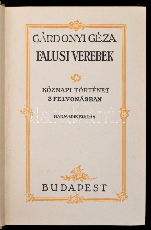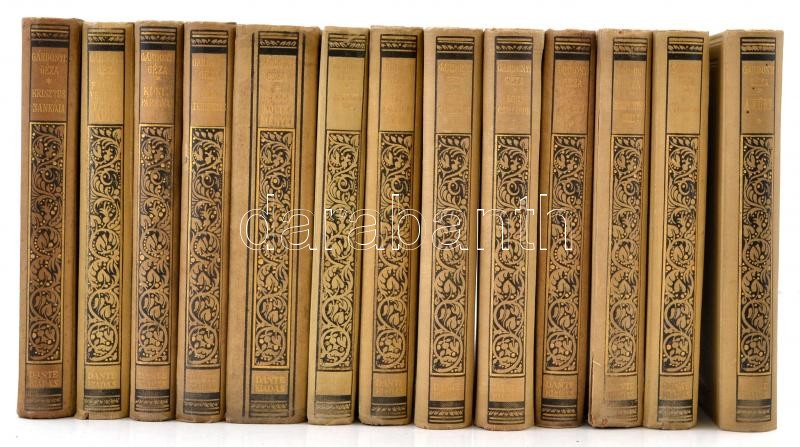 Gárdonyi Géza munkái 13 kötete: Egri csillagok I-II. kötet; Április. Fűzfalevél, nyárfalevél. December; Annuska; A kürt, Falusi verebek. Fehér Anna; Ki-ki a párjával;Öreg tekintetes;Krisztus bankója;Bibi; Aggyisten Biri!;Vallomás; Két Katica-bogár; Bp.,é.n., Dante. Kiadói aranyozott egészvászon-kötés, 10 kötet Szigeti L. kötés, 1 kötet Gottermayer-kötés, többségében kissé kopott borítókkal, alapvetően jó állapotban.