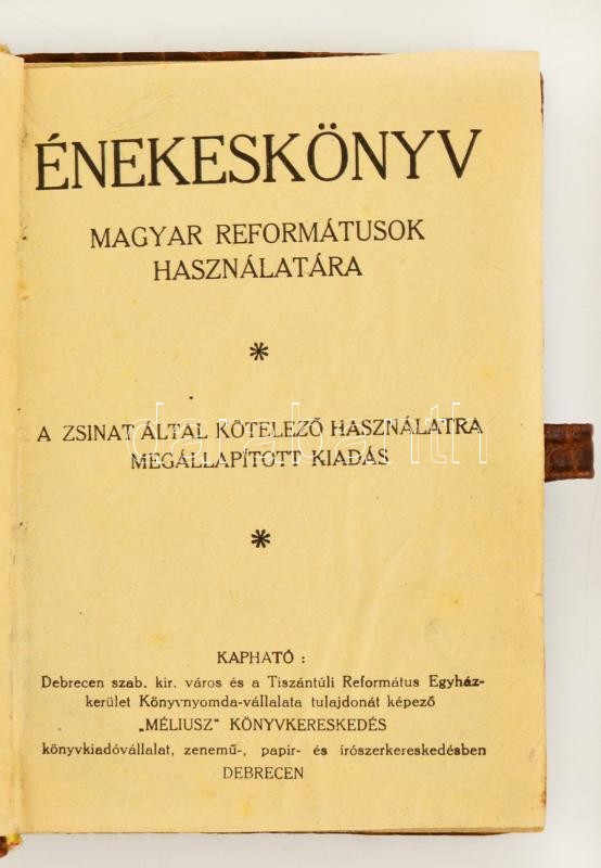 Description: Énekeskönyv magyar reformátusok használatára. A zsinat által kötelező használatra megállapított kiadás. Debrecen, é. n., Méliusz Könyvkereskedés. Kiadói egészbőr kötés, papír védőtokban.