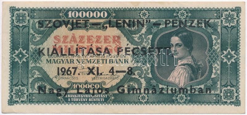 Description: 1946. 100.000MP "Szovjet-Lenin Pénzek kiállítása Pécsett 1967. XI. 4-8. Nagy Lajos Gimnáziumban" fekete felülbélyegzéssel T:III szép papír