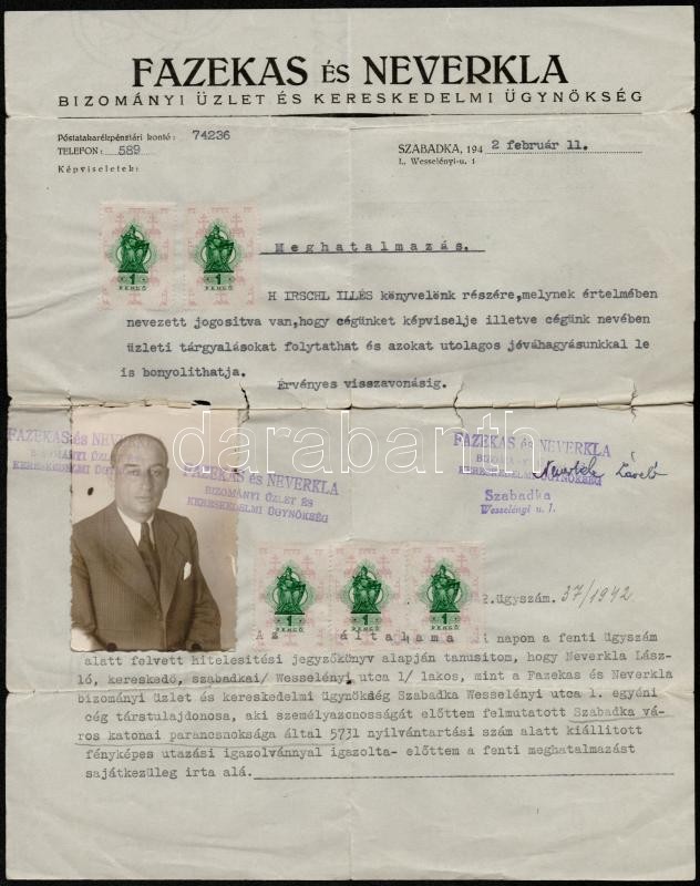 Description: 1942 Szabadka, Meghatalmazási okmány a Fazekas és Neverkla Bizományi Üzlet és Kereskedelmi Ügynökség részéről könyvelőjük Hirschl Illés részére, fényképpel