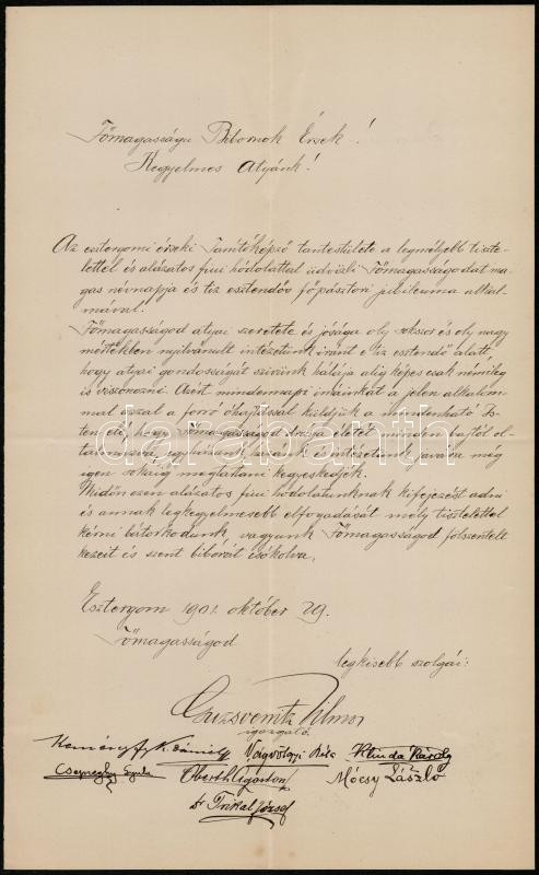 1901 Esztergom, Az érseki tanítóképző tantestülete által aláírt névnapi üdvözlőlevél Vaszary Kolos (1832-1915) bíboros részére