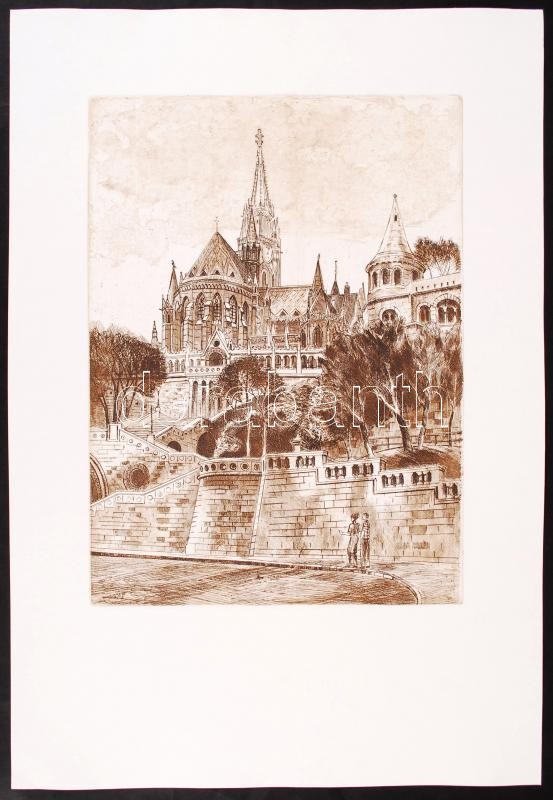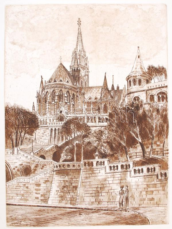 Blahos Rudolf (1917-1986): Halászbástya, rézkarc, papír, jelzés nélkül, 40×30 cm