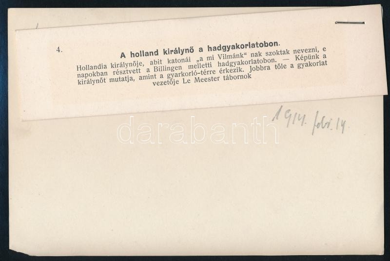 1914 I. Vilma holland királynő hadgyakorlaton, Le Meester tábornok, ko... https://www.darabanth.com/en/314-Online-auction/314.0/Other-collectibles/Photo~100019/1914-I-Vilma-holland-kiralyno-hadgyakorlaton-Le-Meester-tabornok-korabeli-sajtofoto-hozzatC5~II1724266