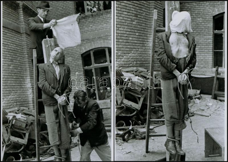 1945 Háborús bűnösök nyilvános kivégzése egy budapesti börtön udvarán, 5 db vintage negatívról készült mai nagyítás, 18x25 cm