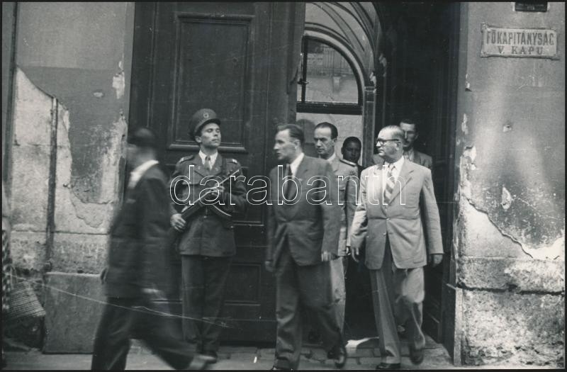 Description: 1948 Kádár János (1912-1989) belügyminiszterként és Münnich Ferenc (1886-1967) rendőrfőkapitányként elhagyják a rendőrség épületét, hátoldalon feliratozott fotó, 12x18 cm