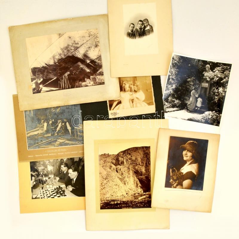 cca 1900-1940 Vegyes fotó tétel, összesen 8 db, köztük nagyméretű fotók, asztalos műhely, műtermi fotók, Karthágó gőzös, Gerőffy Elisabeth táncosnő, sakkverseny, többségük jelzett, 12x17 és 21,5x28 cm közti méretben