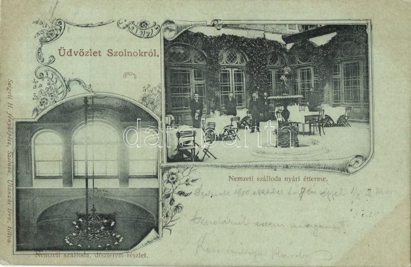 Szolnok, Nemzeti szálloda nyári étterme, pincérek, étterem kerthelyisége, díszterem belső. Szigeti H. kiadása, floral Art Nouveau (EK)