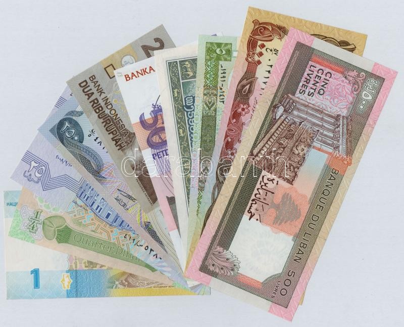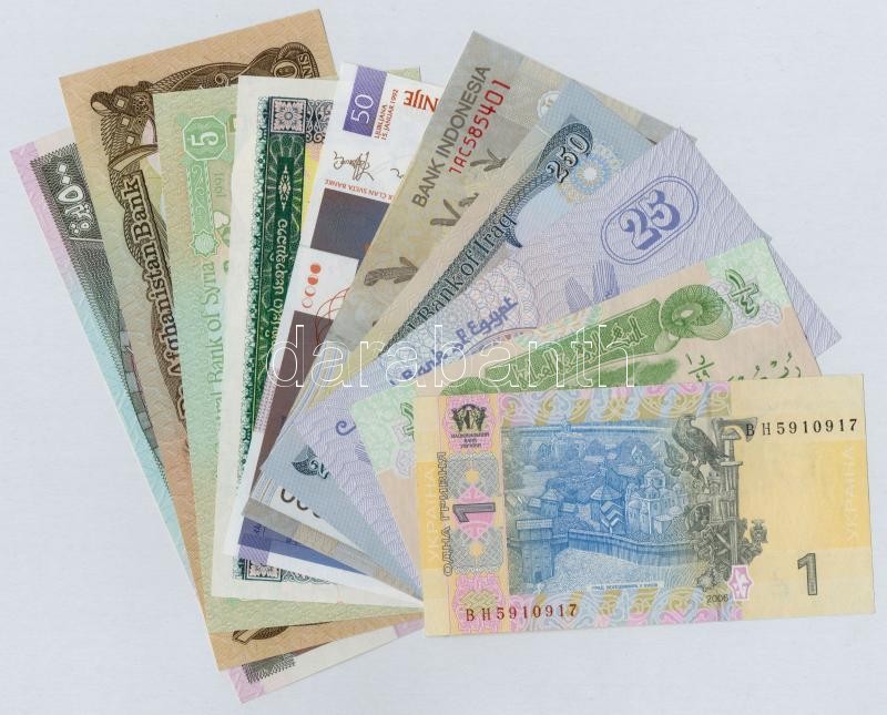Description: Vegyes: 10db-os hajtatlan papírpénz tétel, közte iraki, iráni, egyiptomi és szír bankjegyek T:I