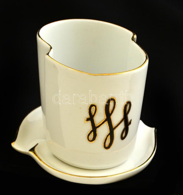 Aquincum tálka és fogpiszkálótartó monogrammal, kézzel festett, jelzett, hibátlan, 9×8 cm, m:6 cm