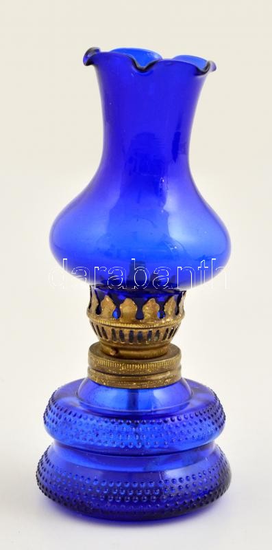 Petróleum lámpa, kék üveg testtel, lepattanással nem látható részen, m: 16 cm
