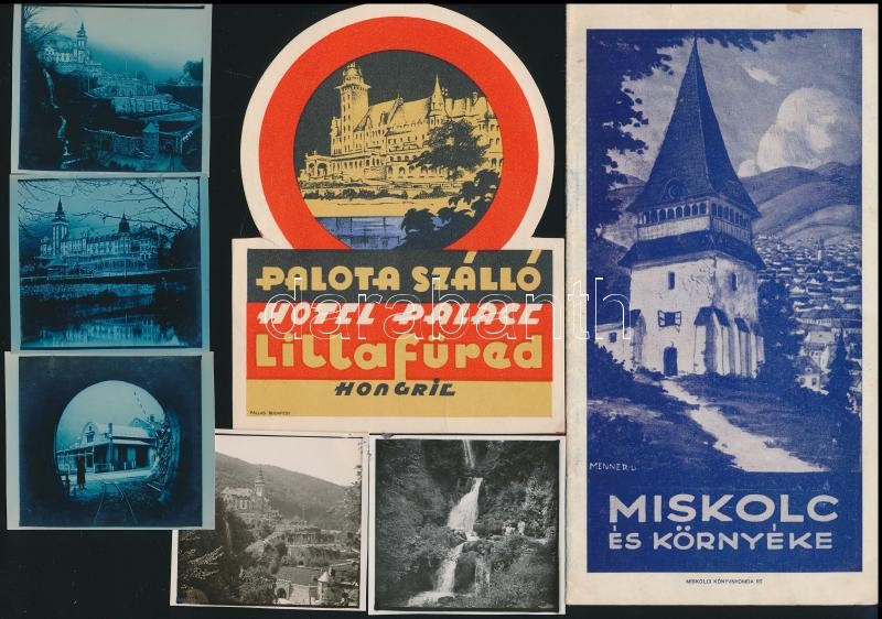 1936 Lillafüredi látképek, vasútállomás, stb., + utazási prospektus + bőröndcímke, fotó: 6x6 cm