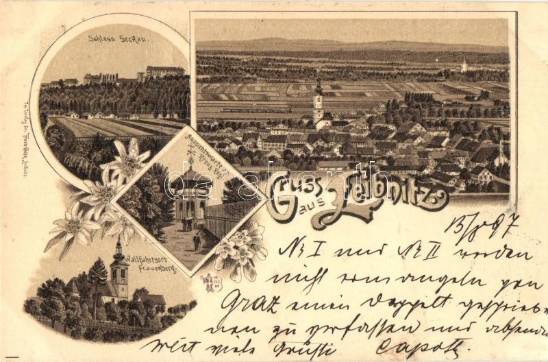 1897 (Vorläufer!) Leibnitz, Schloss Seckau (Seggau), Wallfahrtsort Frauenberg, Aussichtswarte am kreuz Kogl. / castle, church, lookout tower. Art Nouveau, floral, litho (Rb)