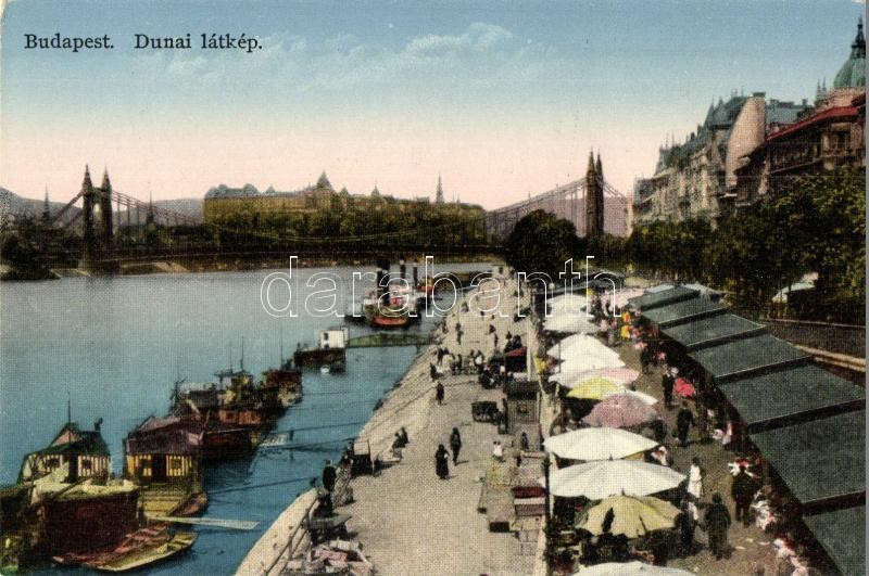 Budapest V. Duna látkép a pesti rakparttal, piac