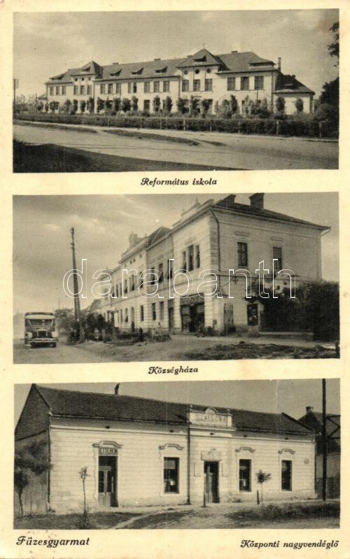 Füzesgyarmat, Református iskola, Községháza, automobil, Központi nagyvendéglő, szálloda és étterem (EK)