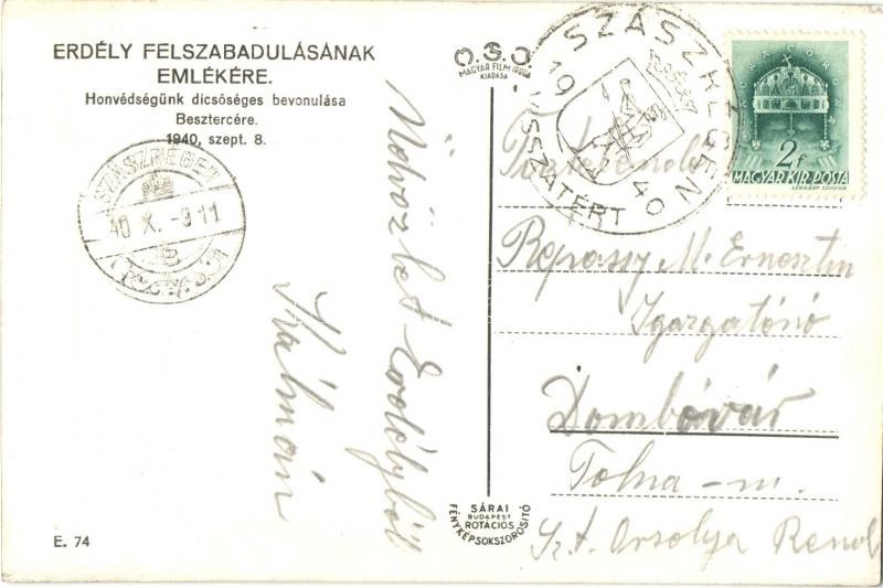 1940 Beszterce, Bistritz, Bistrita; bevonulás / entry of the Hungarian troops "1940 Szászrégen visszatért" So. Stpl