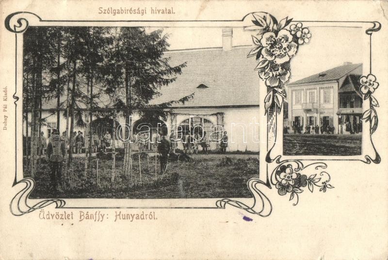 Description: Bánffyhunyad, Huedin; Szolgabírósági hivatal, Dubay Pál üzlete és saját kiadása / constable's office, publisher's shop. floral Art Nouveau (apró szakadások / tiny tears)