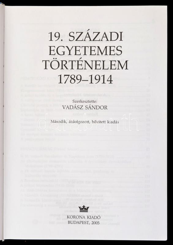 19. század egyetemes történelem 1789-1914. Szerk.: Vadász Sándor. Bp.,2005, Korona. Második, átdolgozott, bővített kiadás. Kiadói papírkötés.