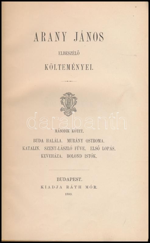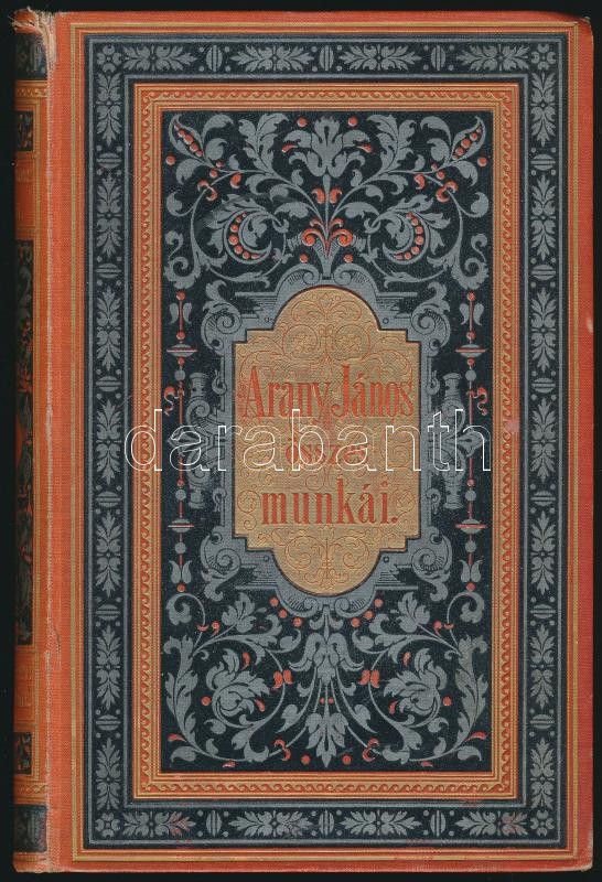 Arany János elbeszélő költeményei II. kötet. Arany János összes munkái III. kötet. Bp.,1883, Ráth Mór, (Prochaska Károly Udvari Könyvnyomdája), 6+464+2 p. Kiadói aranyozott, festett egészvászon-kötés, aranyozott lapélekkel, kissé kopottas borítóval, sérült gerinccel.