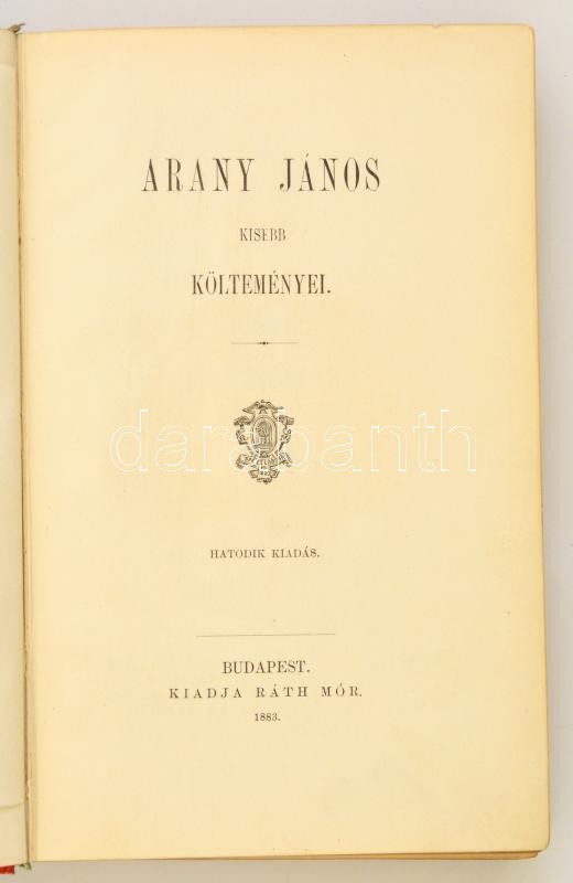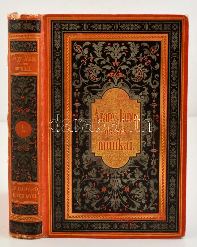 Arany János kisebb költeményei. Arany János összes munkái I. kötet. Bp.,1883, Ráth Mór, (Prochaska Károly Udvari Könyvnyomdája), 2 p.+1 t.+4+448+XV p.Hatodik kiadás. Kiadói aranyozott, festett egészvászon-kötés, aranyozott lapélekkel, kissé kopottas borítóval, kissé sérült gerinccel.