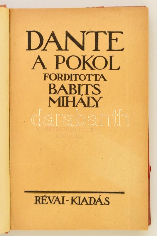 Dante: A pokol. Dante Komédiája I. Bp.,é.n., Révai, 300 p. Félvászon-k... https://www.darabanth.com/en/316-Online-auction/316.0/Books/Books-Other-rarities~2500016/Dante-A-pokol-Dante-Komediaja-I-Bp-en-Revai-300-p-Felvaszon-kotes-kopott-boritov~II1731536