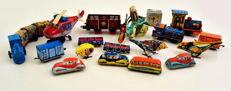 Régi kulcsos (rugós) játékok, mozdonyok, autók, madarak, tartozékok, s...