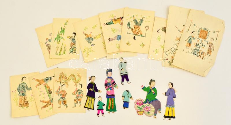 XX. sz eleje. 12 db kínai rajz + 7 db rajzolt és szövettel bevont figu...