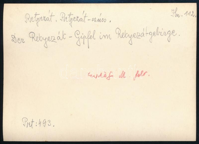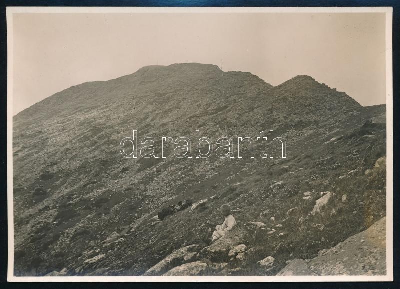 cca 1910 Retyezát, a Retyezát-csúcs, Erdélyi Mór felvétele, hátulján feliratozva, pecséttel jelzett, 11,5×16 cm / cca 1910 Munţii Retezat, the Retezat Peak, vintage photo, with notes on its back, 11,5×16 cm