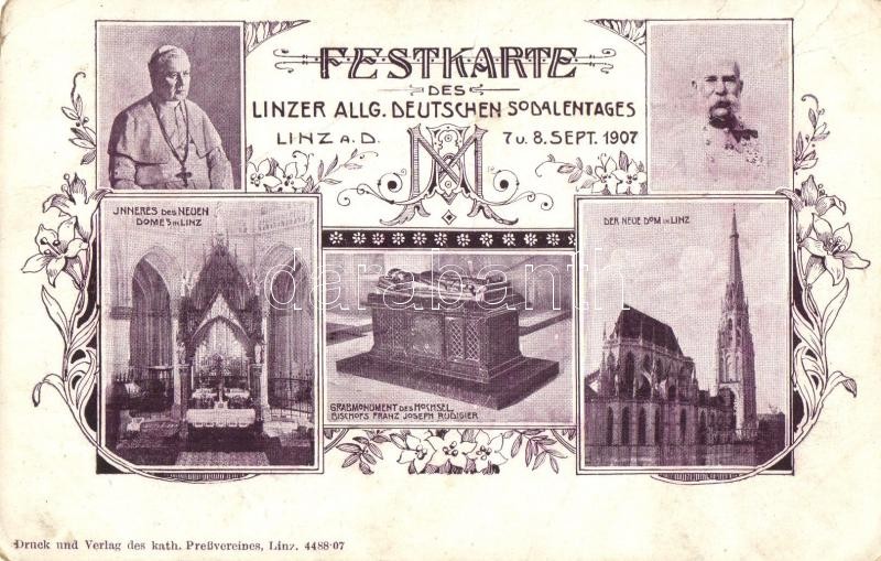 1907 Linz, Festkarte Linzer Allg. Deutschen Sodalentaged. Franz Jospeh, church interior. Art Nouveau, floral (fa)