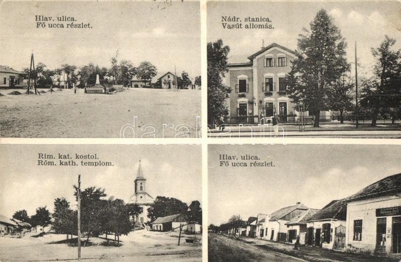 Köbölkút, Gbelce; Hlav. ulica, Nádr. stanica, Rim. kat. kostol, Hlav. ulica / Fő utca, Vasútállomás, vasutasok, Római katolikus templom, Waldmann Adolf üzlete / main street, railway station, railwaymen, church, shop (EK)