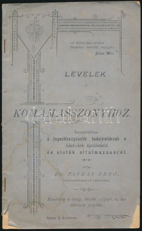 Dr. Farkas BenÅ‘: Levelek a Komámasszonyhoz. Ismertetése a legszükségesebb tudnivalóknak a kisdedek ápolásáról és életük oltalmazásáról. Komárom, 1896, Spitzer Sándor-ny., 46 p. Kiadói papÃrkötés, foltos, kissé sérült borÃtóval.