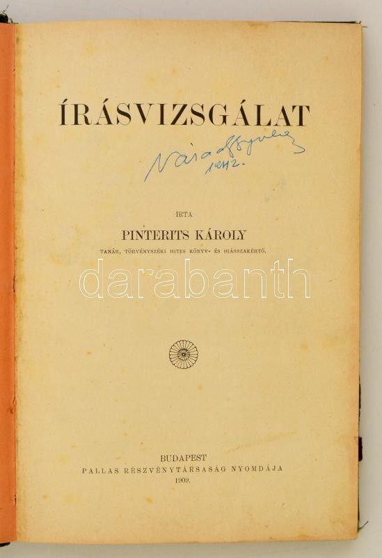 https://www.darabanth.com/en/317-Online-auction/317.0/Books/Books-Other-rarities~2500016/Pinterits-Karoly-Irasvizsgalat-Bp-1909-Pallas-Kopott-felvaszon-kotesben~II1746372