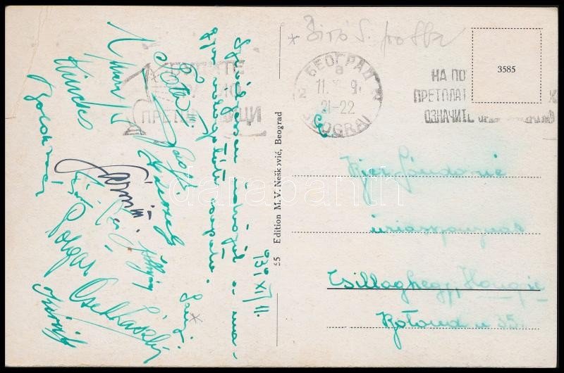 Description: 1939 A magyar labdarúgó válogatott tagjai által aláírt és Bíró Sándor (1911-1988) által írt képeslap Sárosi, Kincses, Polgár, Cseh László, Király és mások / Hungarian national football team autograph signed postcard