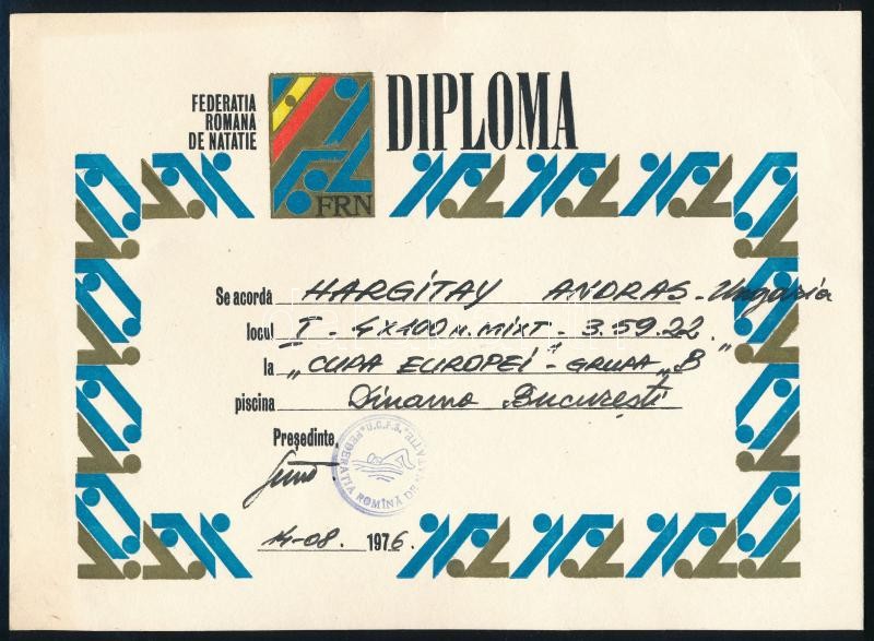 1976 A Román Úszószövetség oklevele Hargitay András részére